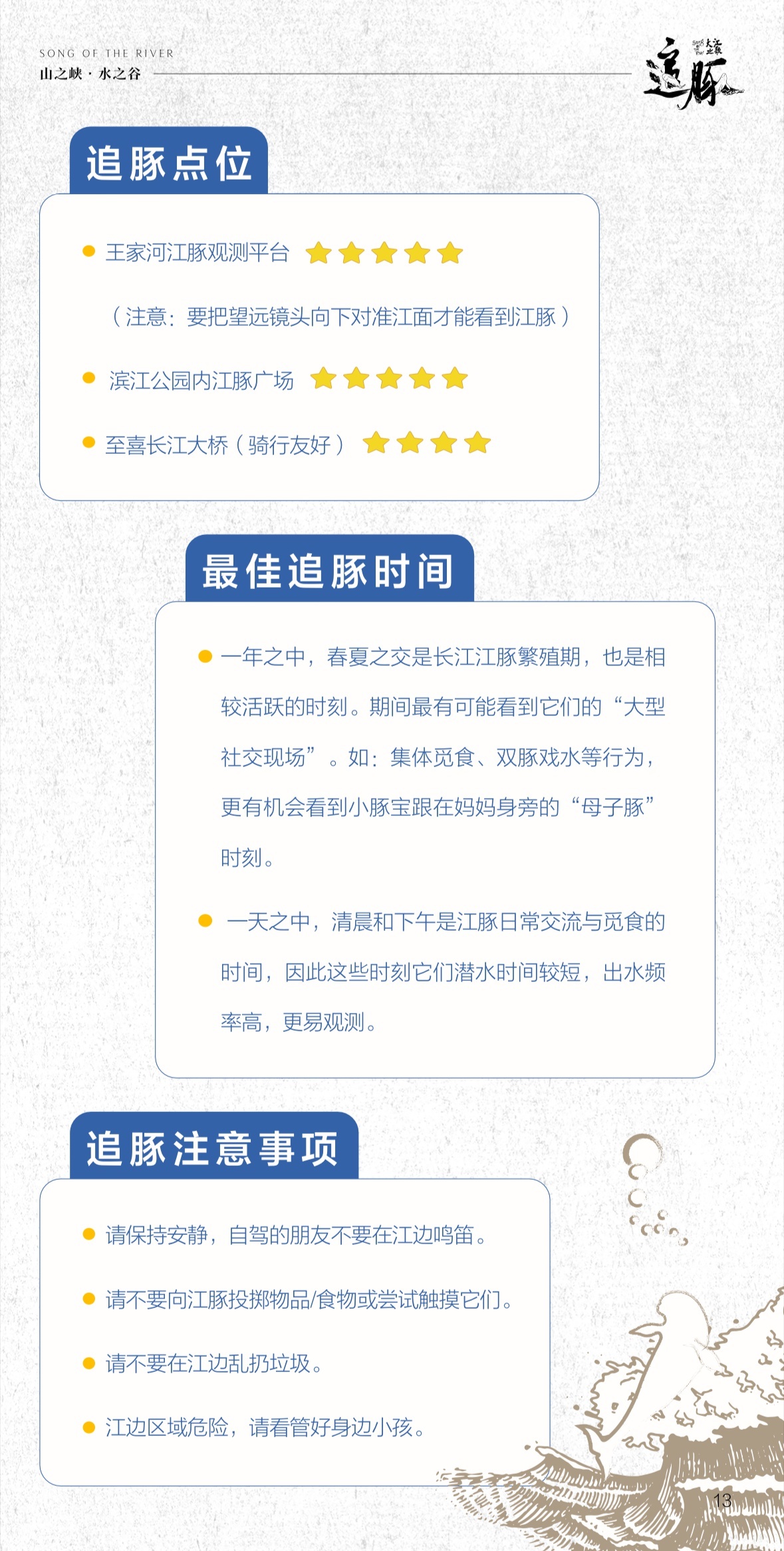 与“追豚地图”相辅相成的“赏豚攻略”,则为渴望亲身体验江豚魅力的公众提供了可实地打卡的追豚指南。该攻略精心规划了恩施-宜昌、荆州-岳阳、九江-上饶、安庆-铜陵、南京五大追豚线路,连通近2000公里。