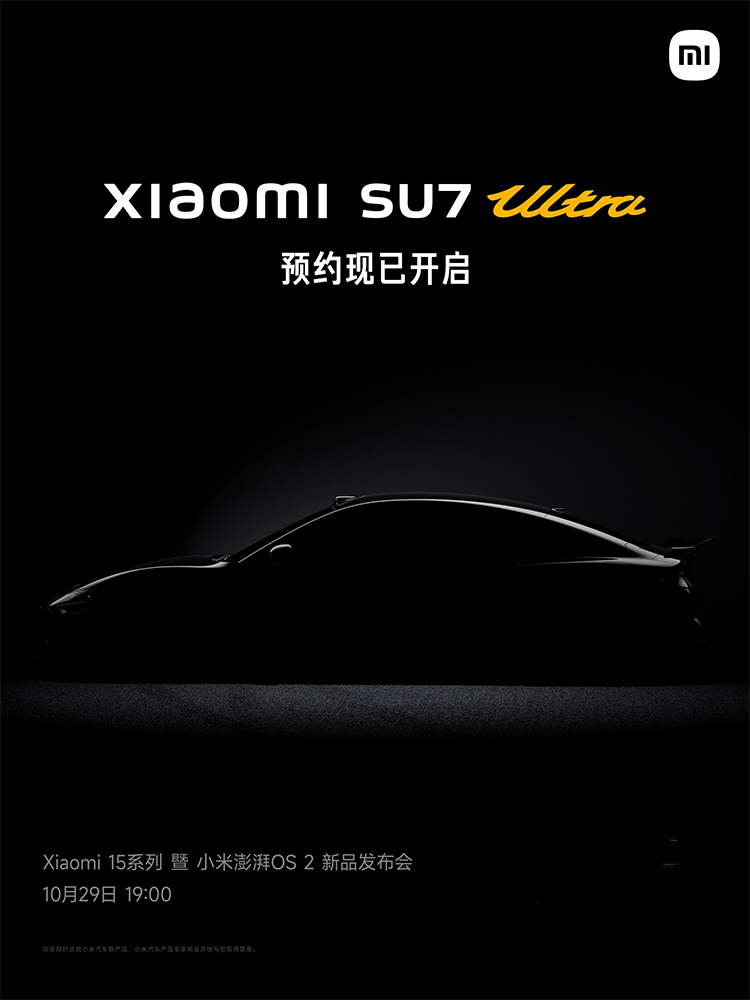 10月24日消息,今天,小米汽车正式宣布,小米SU7 Ultra量产版将于10月29日,在小米15系列发布会上同场亮相,目前新车已经开启了预约。