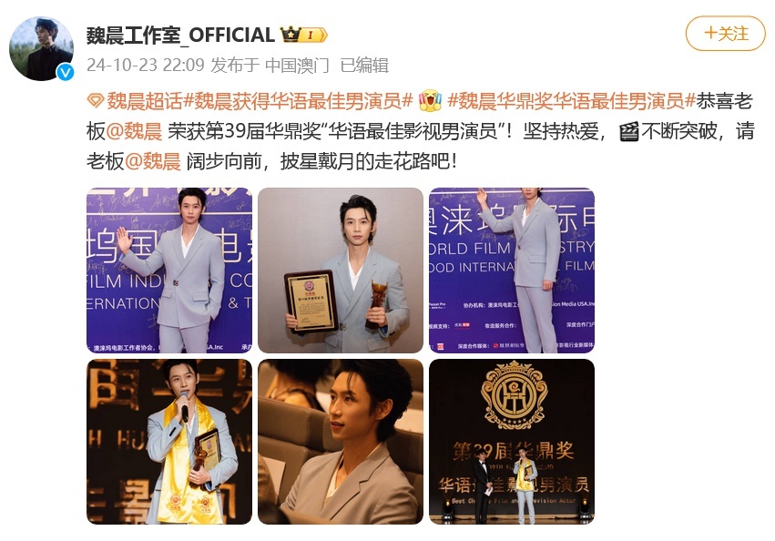 魏晨工作室晒出老板的领奖图写道:“恭喜老板魏晨荣获第39届华鼎奖‘华语最佳影视男演员’!坚持热爱,不断突破,请老板魏晨阔步向前,披星戴月地走花路吧!”