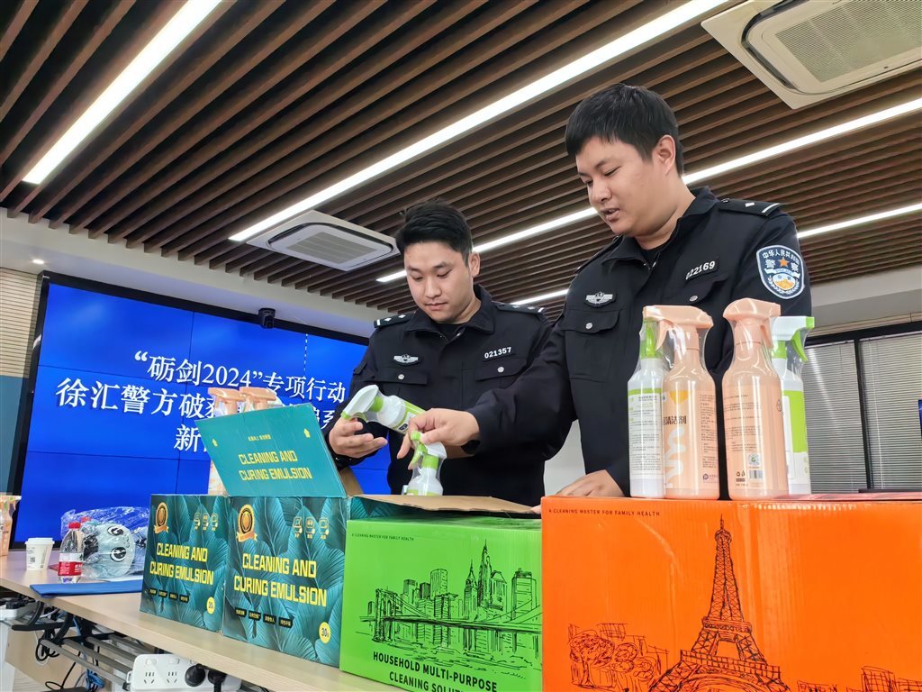 10月16日,徐汇警方在外省警方的协助下,抓获了程某、刘某、王某等犯罪团伙成员10人,查获作案用车一辆,以及还未销售的洗洁精产品20余箱。