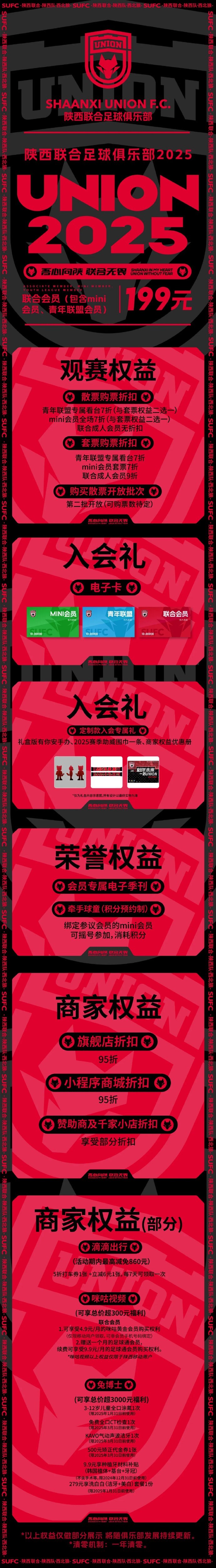 2025年陕西联合足球俱乐部会员新增了“菁英会员”,并将青年联盟和mini会员纳入了联合会员体系,青年联盟可加入用户年龄调整为18岁-22岁,更改后会员体系共分为三个类别: