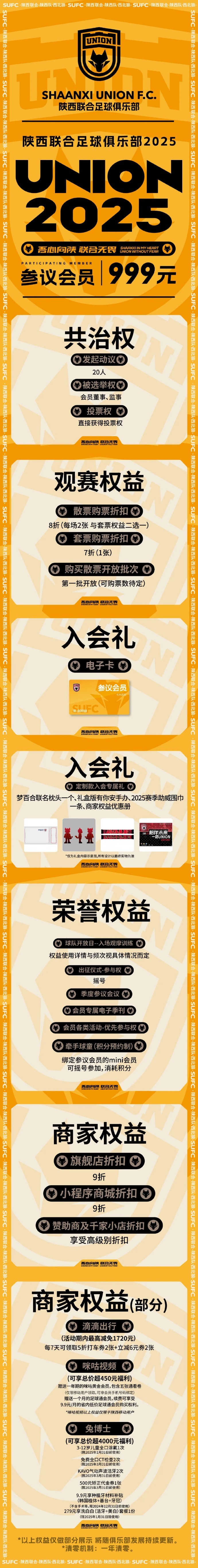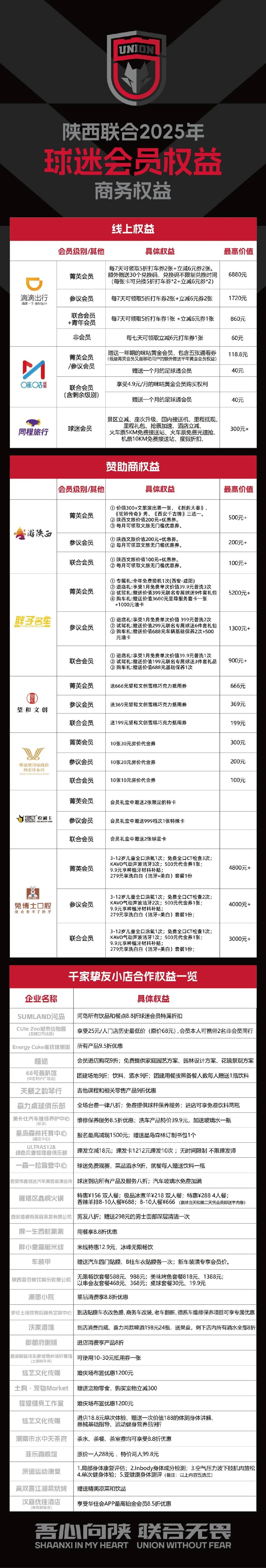 商务(商家)权益详情是由陕西联合足球俱乐部联合广大合作伙伴推出的陕西联合会员专属权益,是2025年陕西联合会员权益体系的重要组成部分,在俱乐部的不断对外合作拓展下,会员权益也将不断增加,具体详情如下:
