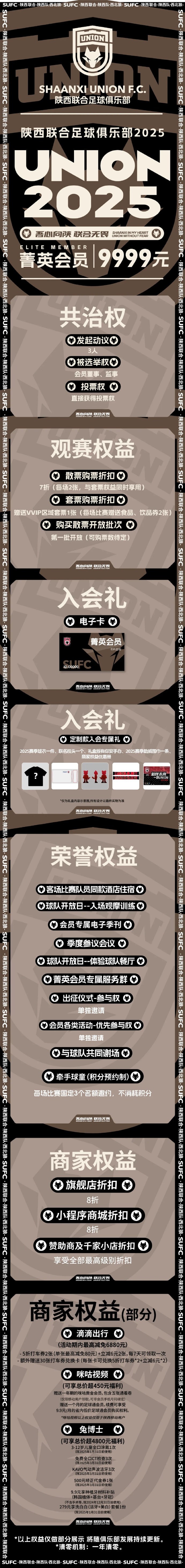 北京时间10月24日,陕西联合足球俱乐部宣布调整俱乐部会员体系,新增了年费9999元的“菁英会员”,并且将此前的“青年联盟”和“mini会员”合并进了年费199的“联合会员”。