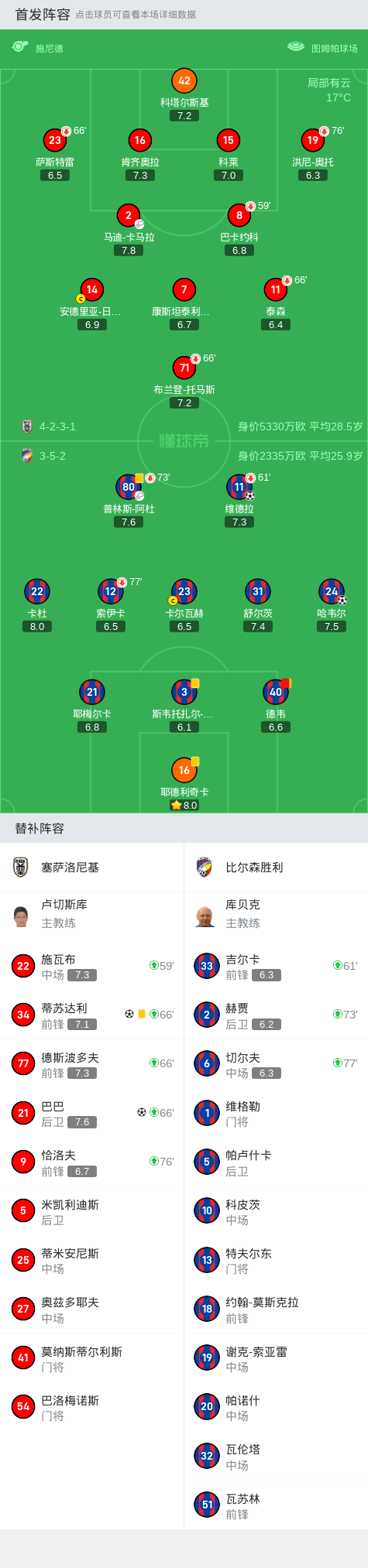 在欧足联欧洲联赛的较量中,塞萨洛尼基与比尔森胜利展开了一场激烈的对决。比赛中,比尔森胜利的普林斯-阿杜为哈韦尔送出精妙助攻,帮助球队率先取得进球。随后,维德拉再下一城,进一步扩大了比尔森胜利的领先优势。 比赛进入下半场后,塞萨洛尼基展开反击。德斯波多夫为蒂苏达利送上助攻,蒂苏达利不负众望,为球队扳回一城。比赛接近尾声时,马迪-卡马拉助攻巴巴,巴巴成功将比分扳平。 最终,双方以2-2握手言和,各自收获一分。比赛中,德韦因累计黄牌被罚下场,给比尔森胜利带来了一定的挑战。整场比赛充满了悬念和精彩瞬间,双方球员都展现了出色的竞技状态。
