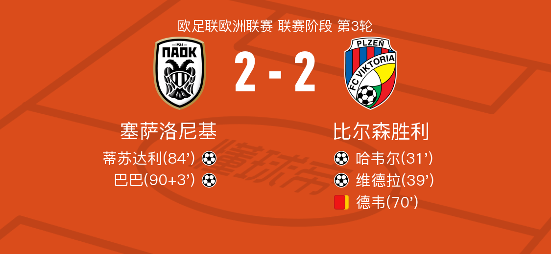 下半场补时第3分钟,塞萨洛尼基球员马迪-卡马拉助攻巴巴打入一球。