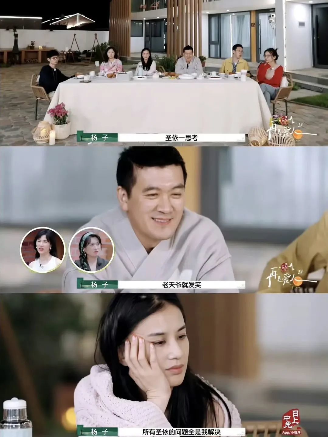 这边黄圣依在说他在家庭关系中缺位的事实,那边杨子要不满不在乎地抬头看天象,要不就在无赖地为自己辩解,表示自己也有陪伴小孩,然而实际上他所谓的陪伴小孩就是带小孩去上班的地方开会。