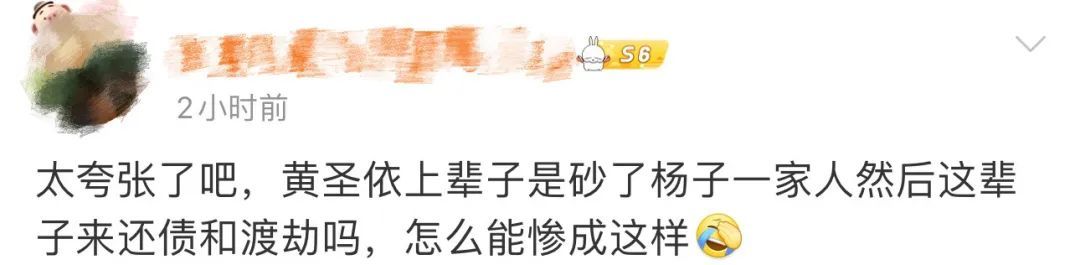 继而同情起黄圣依,上辈子到底是怎么对不起杨子一家人了,这辈子还债和渡劫来了,不然惨成这样说不通啊...