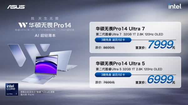 此次发布的无畏Pro14 Ultra7版本售价为8699元,首发价7999元;Ultra5版本售价为7699元,首发价6999元。即日起至12月31日,购买华硕轻薄本还可参与以旧换新活动,部分地区用户最高可享20%补贴加持,至高优惠2000元。