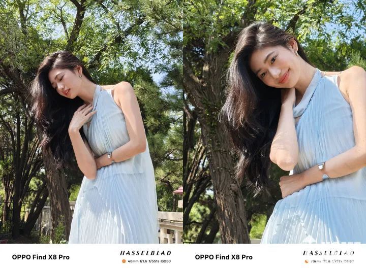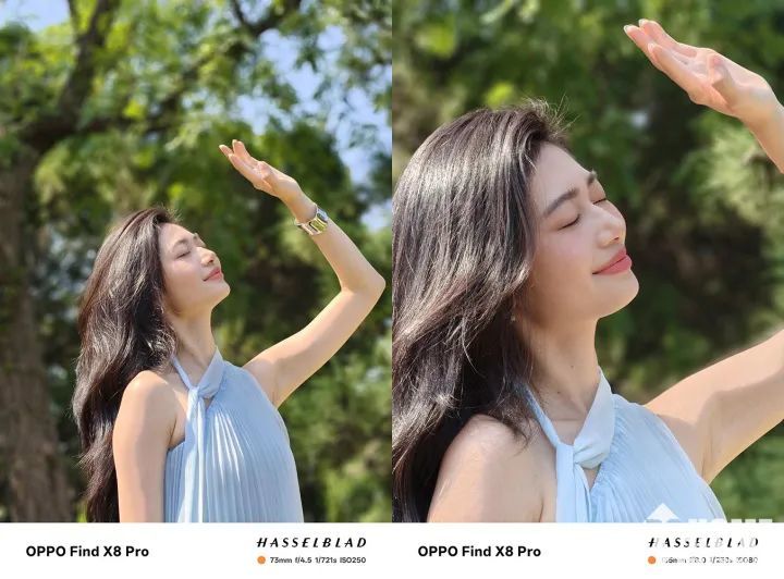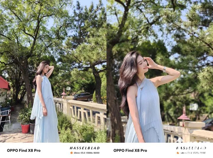 在人像拍照上,Find X8 Pro在全面的焦段覆盖下,无论远近都能拍得很美,这点其实在Find X7系列中就做到了。Find X8 Pro保持了哈苏人像的优秀表现,远近同样清晰,甚至连头发丝都能拍得一清二楚,也说明了抠图的准确性。全身、半身、特写原地变焦直接就能拍,背景的虚化效果也很自然。