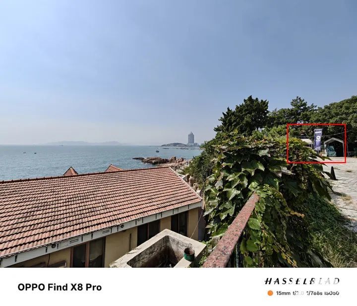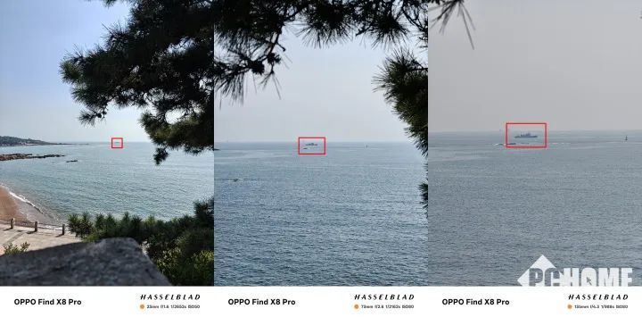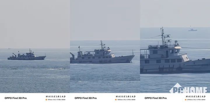 在长焦的表现上,两颗潜望长焦接力本身就能覆盖很高的光变范围,在20倍以上变焦,则会启动AI千里长焦,通过AI来优化画质。60X是AI优化的分界线,60倍以下是在保留真实质感的前提下进行清晰度增强,60倍以上则会优先提升清晰度,确保能先拍到。我们先看上面这组样张,主摄拍照的照片很难让人注意到远处的船,即便在6X变焦也只是看个大致轮廓。