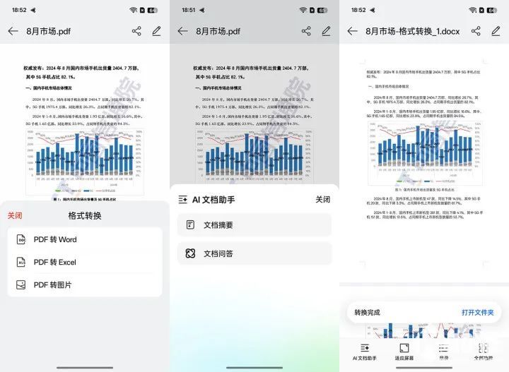 除了日常生活场景,ColorOS 15通过AI语音摘要、AI笔记助手和AI文档助手这三项功能,在办公的效率上很高。同时也能通过拍照或截屏,将图片中的文字信息快速转换成文档,方便编辑使用。对于大家头疼的PDF文件,也能通过文档进行转换,简直就是职场人士的福音。