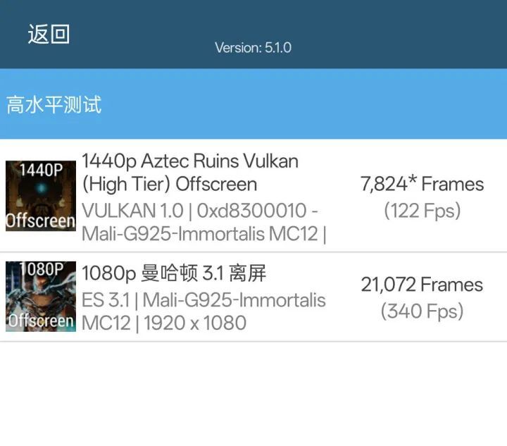 接下来就要给Find X8 Pro加压了,首先来看基准性能测试,这里就直接上强度,GFXBench曼哈顿3.1场景340帧,阿兹特克1440P Vulkan场景122帧,大幅领先于前代机型。显然,即便是首次采用天玑平台,Find X8 Pro的性能也是第一梯队。