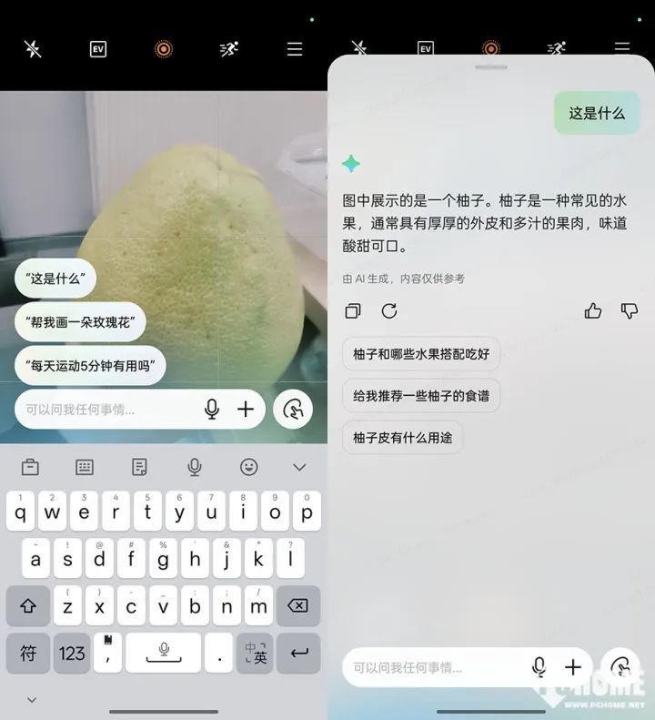 一键问屏可以通过长按导航栏或设置长按电源键激活,而后系统就会根据屏幕当前内容,弹出相应的快捷交互按钮。注意,识别的是当前屏幕内容,因此你想问什么,不用拍照、不用截屏,直接用就是了。我们使用相机对准一个柚子,然后呼出小布,第一个按钮就是“这是什么”,点击后就会进行识别并给出答案。如果快捷按钮没有你的问题,那么只要对小布说出或打出问题内容即可,问题只要口语化即可,小布现在的智能完全能听得懂。