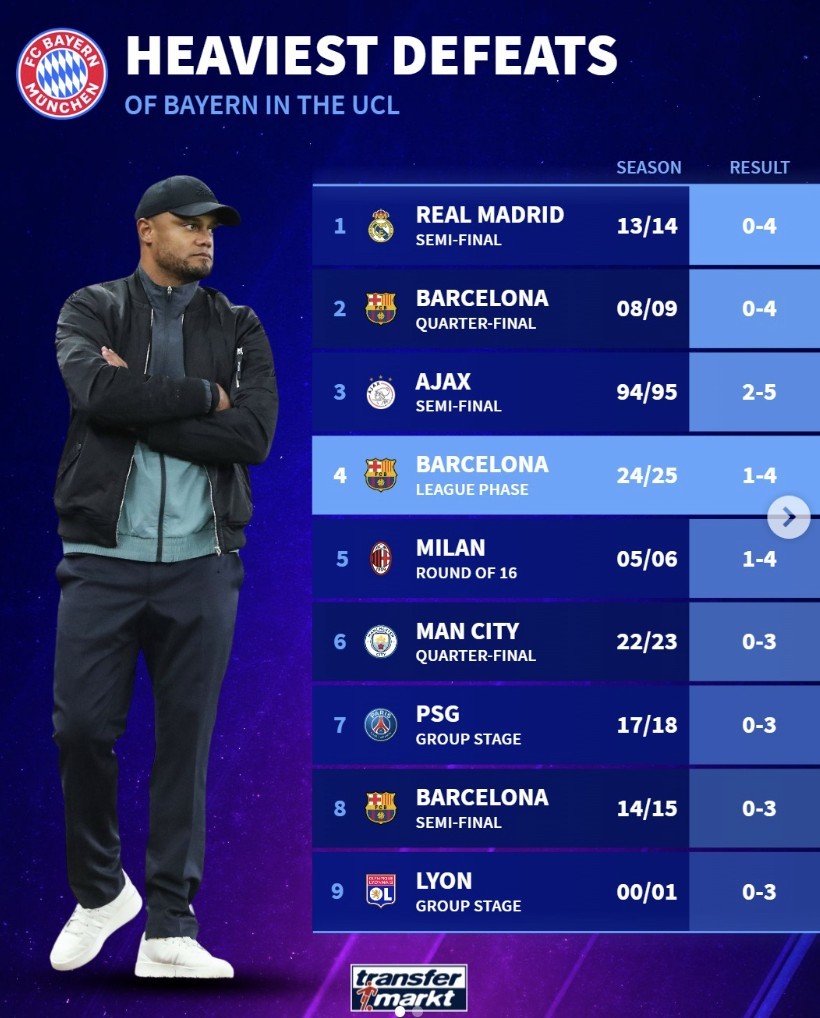 北京时间10月24日凌晨,拜仁慕尼黑在客场1-4不敌巴塞罗那。赛后,德国转会市场列出了拜仁在欧冠的最大比分失利。其中,拜仁0-4皇马、0-4巴萨居首,本场1-4不敌巴萨的比赛排在第四。