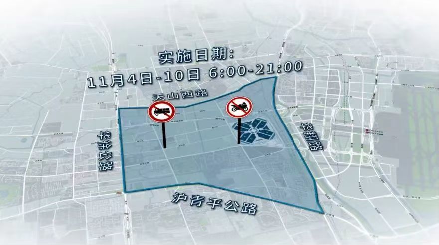 (二)11月4日至11月10日,每日6时至21时,沪青平公路-华徐公路-天山西路-华翔路合围区域(不含上述道路),禁止载货机动车和摩托车通行。