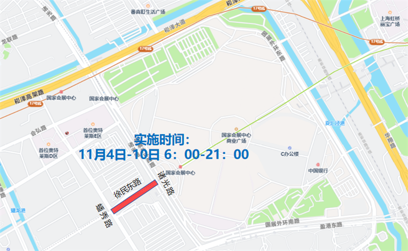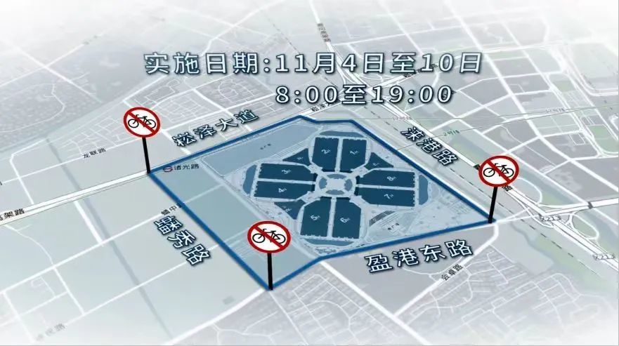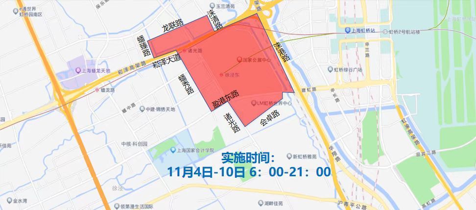 (三)11月4日至11月10日,每日6时至21时,在会卓路-诸光路-盈港东路-蟠秀路-崧泽大道-蟠臻路-龙联路-涞清路-崧泽大道-涞港路合围区域(除蟠秀路、蟠臻路、龙联路外,含上述道路)。