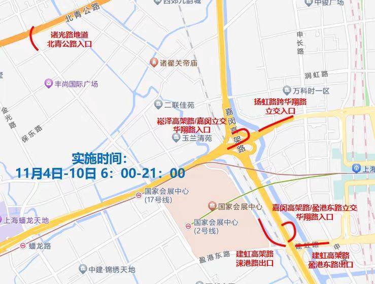 以及嘉闵高架路/盈港东路立交华翔路入口、建虹高架路盈港东路出口、建虹高架路涞港路出口、扬虹路跨华翔路立交入口、崧泽高架路/嘉闵立交华翔路入口以及诸光路地道北青公路入口,除下列车辆外,禁止其他机动车通行:执行公务的警车、消防车、救护车、工程抢险车;公交运营线路车辆;出租车;持有公安机关核发的各类进博会车辆证件和《控制区预约停车证》的车辆。