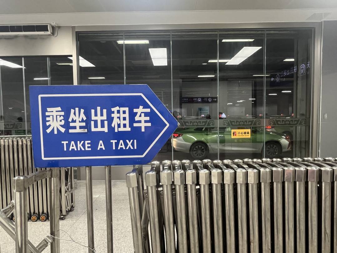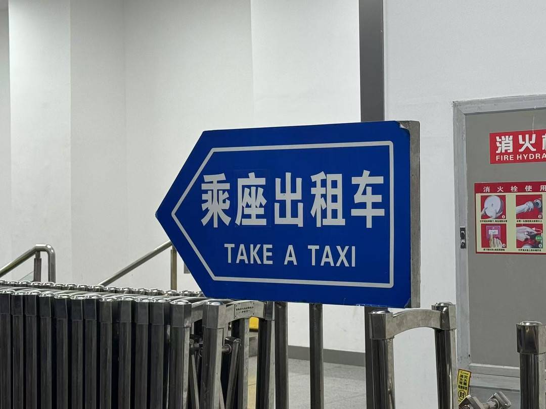 10月25日晚9点半左右,封面新闻记者来到成都东站,在出租车上客处,有一个显眼的蓝色指示牌。记者注意到,该指示牌面向墙的一面写的是“乘坐出租车”,面向玻璃的一面写的却是“乘座出租车”。