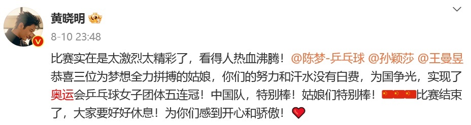 赛后,陈梦表哥黄晓明发文:感谢两位运动员带给我们这么精彩的比赛!看得我都要喘不过气!姑娘们都是好样的!恭喜梦梦!你做到了!你扛住了所有压力再一次用实力证明了自己!你永远是我们的骄傲!所有的努力和汗水都是值得的!接下来的比赛继续加油!