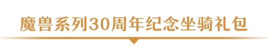 用魔兽系列30周年纪念坐骑礼包*,欢庆30年的史诗冒险!内含4款适用于《魔兽世界》与经典怀旧服的标志性坐骑。无论你是在守卫艾泽拉斯,还是在征服新的土地,这些坐骑都能让你秀出自己的风范,为魔兽的传奇增添荣耀!