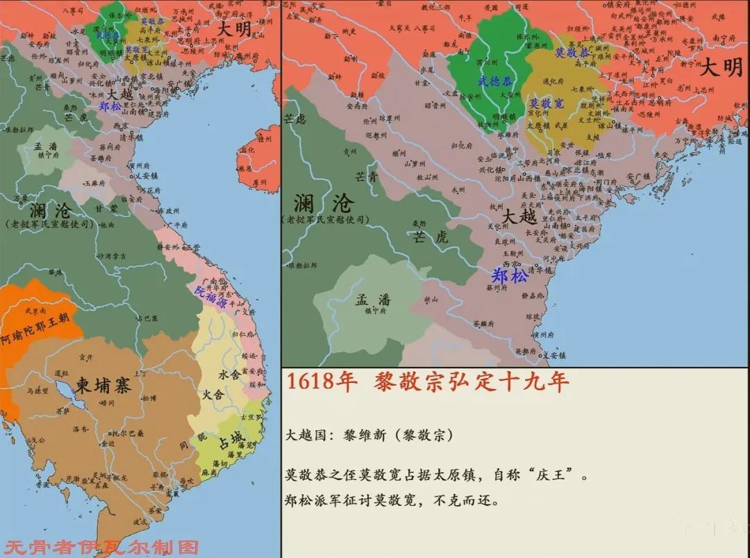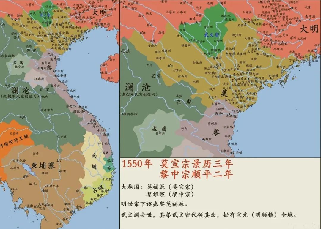 越南在原先“三朝并存”(后黎、莫、武)的情况下,进入“四足鼎立”(郑阮莫武)的新态势。