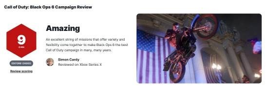 《使命召唤21:黑色行动6》媒体评分解禁,IGN为本作的单人战役模式打出了9分好评。评测者表示,这一代的战役是多年以来COD系列最好的一作,游戏关卡整体质量高,剧情也很优秀。