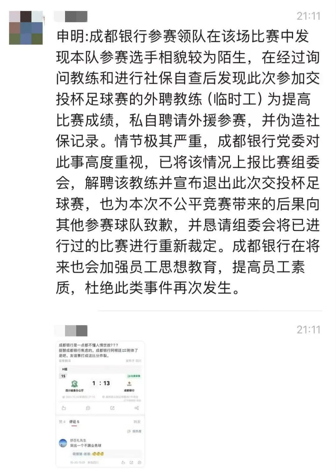 成都交投告诉成都足协,比赛继续办,网传为谣言,“我就在比赛现场,只是比分差太大,没有到(请外援,伪造社保)这个层面,成都银行内部也没有这种说法。