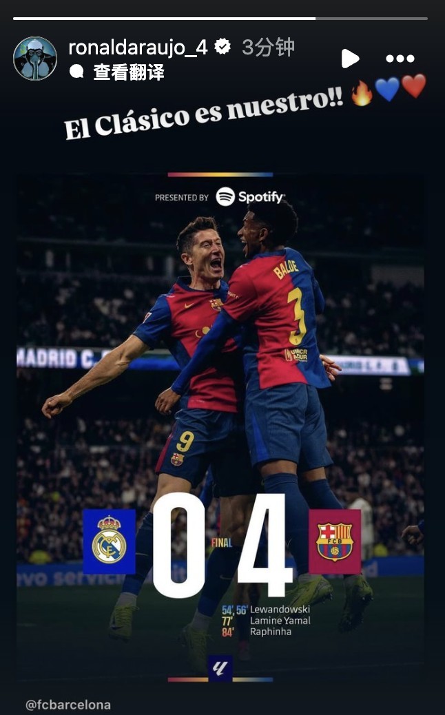 西班牙国家德比,巴塞罗那4-0击败皇家马德里,因伤无法出战的阿劳霍在社交媒体上发文祝贺了球队。