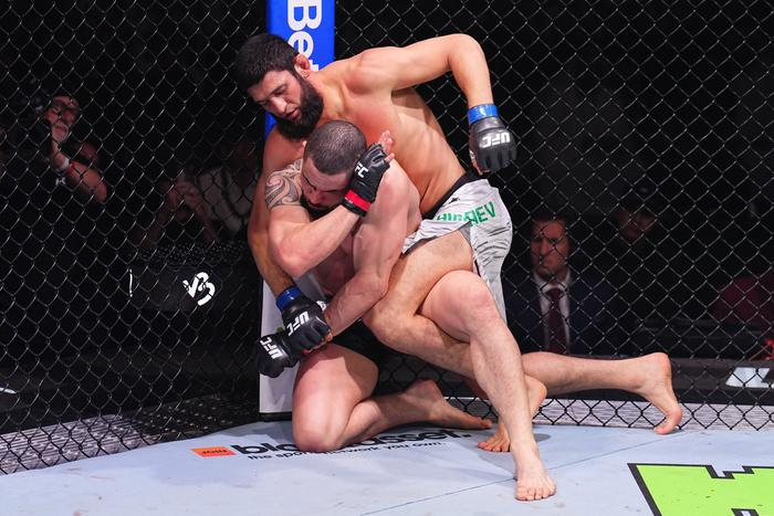 这一次,两人的比赛在UFC308于当地时间10月26日在阿布扎比震撼开战。比赛一开始双方不断灵活的试探,惠特克低扫奇马耶夫还以颜色,短暂的腿法试探后奇马耶夫一记后手拳虚晃直接下潜抱腿把惠特克拖入地面,惠特克尽量贴近笼网边,奇马耶夫一直背后控制惠特克左腿勾住惠特克的大腿,还连续的顶膝进攻控制了比赛节奏,惠特克全力抵抗拼命防守不给奇马耶夫裸绞的机会。