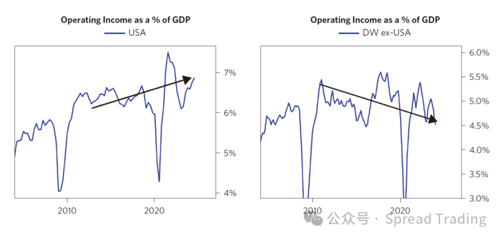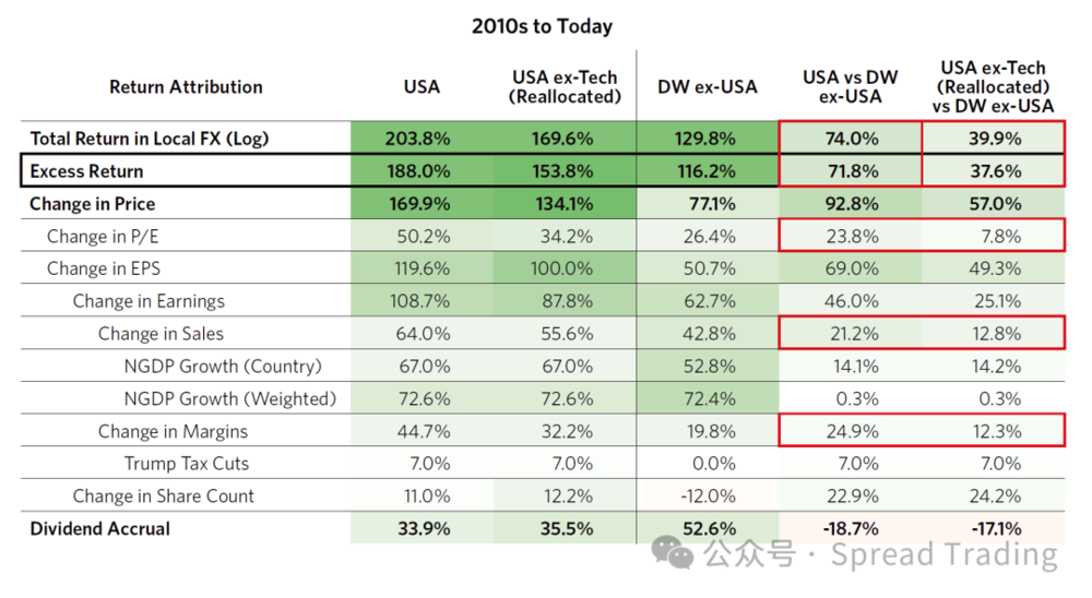 表观上体现为:2010年以来美股标普500,涨幅超过6倍,投资回报率远超全球其他市场——即便是剔除科技股。