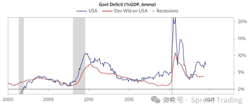 如下图所示,美国政府的赤字规模与赤字率显著高于其他发达经济体。