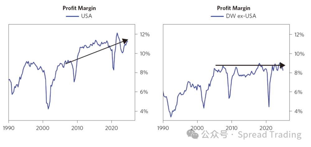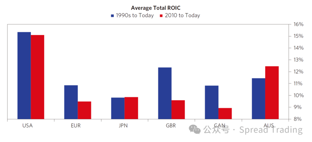 美国公司更高的投资资本回报率(ROIC),更快的营收增长和利润率扩张,以及伴随着高增长和低风险溢价的更高P/E估值水平。