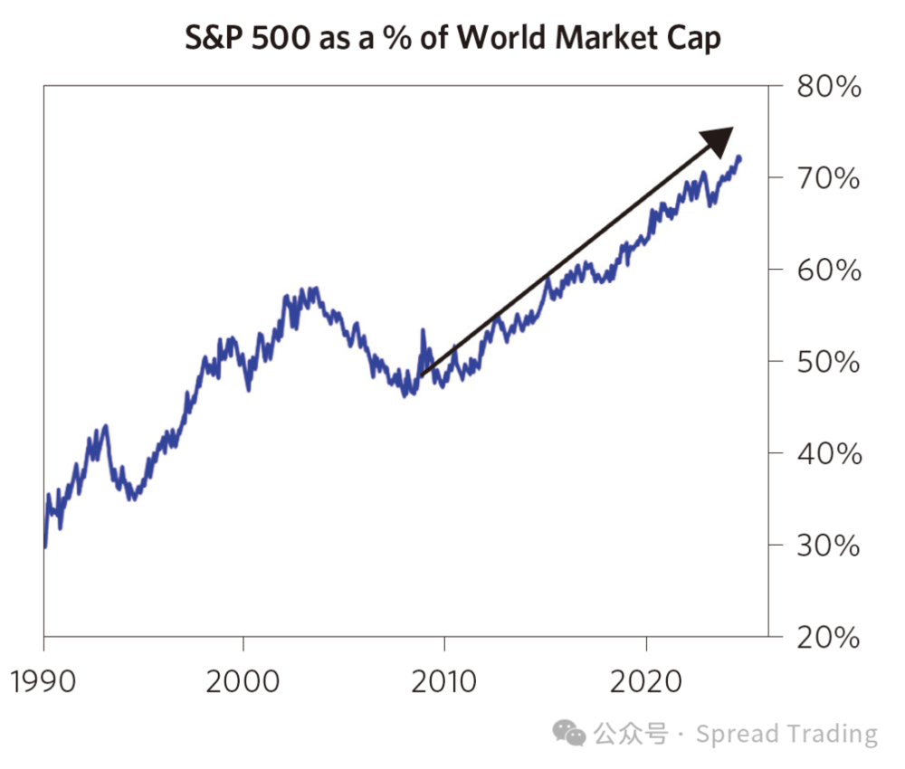标普500的市值规模亦创纪录地超过全球资本市场的七成比例。