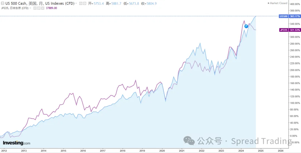 下图展示了2012年至今,日经指数与标普500的走势对照。
