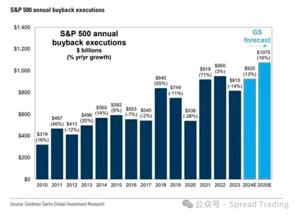 GS还预测,标普500公司今年回购规模将+13%至9250亿美元,2025年将+16%至1.075万亿美元。