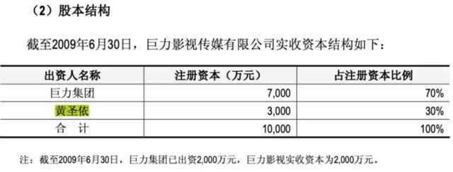 黄圣依则是以巨力索具控制的企业之一巨力影视股东的身份,出现一次。据《招股书》披露,巨力影视成立于2009年5月18日,由巨力集团持股70%、黄圣依持股30%。2009年上半年,巨力影视总资产、净资产、净利润分别为3111万元、2401万元和1.5万元。