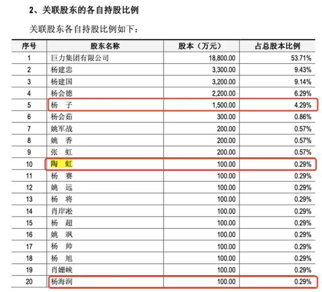 但在巨力索具2009年的《招股书》中,杨子的配偶为陶虹,两人还有一个女儿名为杨海润,陶虹、杨海润均在巨力索具持股0.29%。
