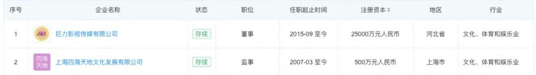 企查查显示,杨子与黄圣依共同持股、仍存续的企业共两家,分别为巨力影视有限公司和上海四海天地文化发展有限公司。其中巨力影视由杨子出任总裁,黄圣依出任执行总裁,两人分别持股30%、10%。