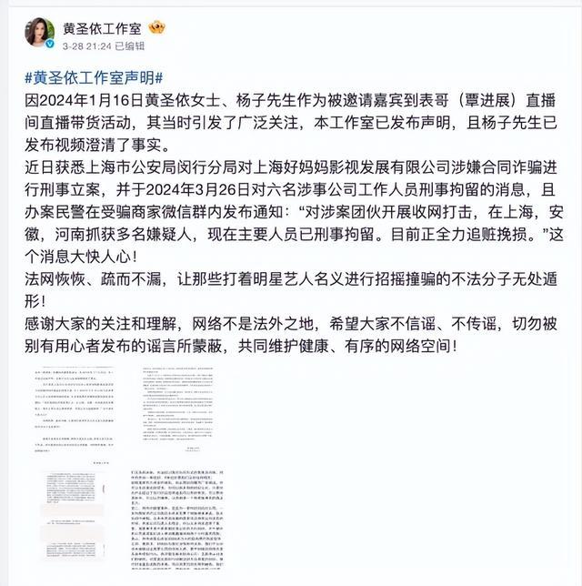 黄圣依工作室回应表示,黄圣依和杨子是应抖影文化邀请,作为嘉宾到@表哥(覃进展)的直播间助力推介带货。两人没有作出过任何形式的招商等授权以及任何保量等承诺,且两人全面履行完成了合约内容,包括约定的直播时长、需以嘉宾身份助力推介30个指定产品等。已第一时间敦促抖影传媒对各商家、各品牌方严格履约,及时妥善处理善后事宜。