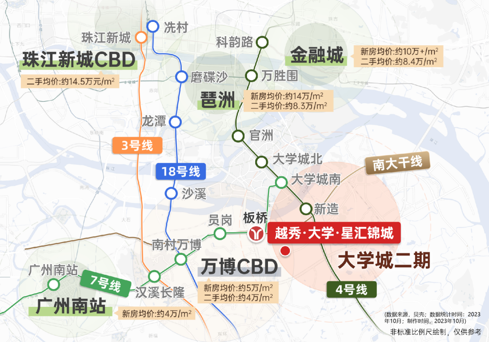 在交通出行层面,地铁出行2站万博,4站琶洲,6站珠江新城,更有南大干线等城市主干道在旁,能快速融入珠金CBD生活圈。(距离板桥站约2.2km,新造站约3.5km,数据来源:百度地图直线距离;琶洲:地铁4号线,新造-万胜围;万博:地铁7号线,板桥-南村万博;珠江新城:地铁7号线板桥-南村万博转地铁18号线南村万博-冼村)