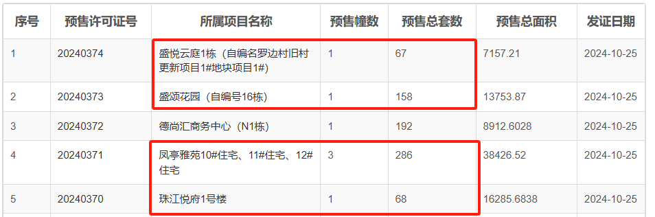 10月25日,广州住建局共批复5张预售证,4张为住宅项目,其中包括位于番禺区的星河盛世锦城,越秀星汇锦城,分别获批住宅房源67套盒158套,位于南沙区的中铁阅江来获批286套,位于荔湾区的兰园江悦获批68套。