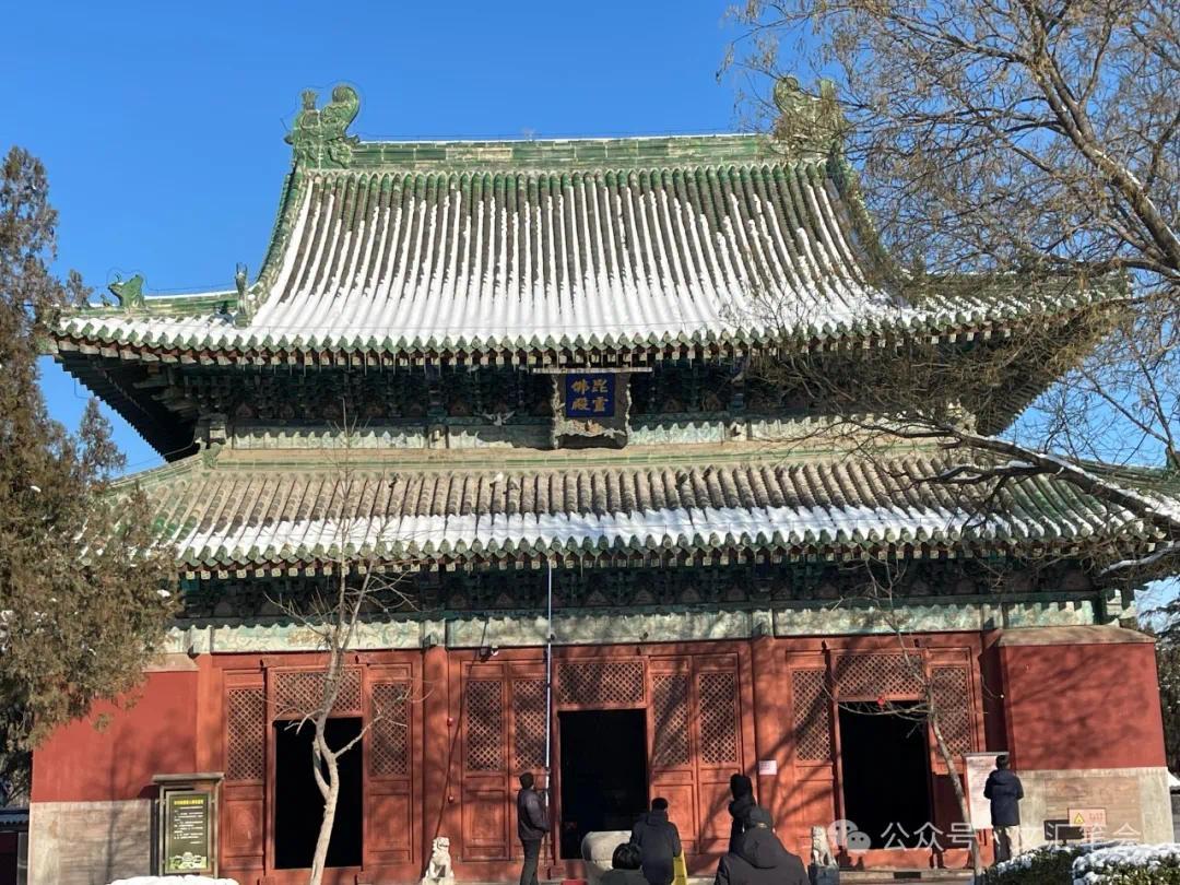 雪后的华北,阳光明媚,尽管气温有点低,空气却清新。隆兴寺瓦楞上还留着薄薄的一层雪,画出被林徽因所称道的中国古建屋顶最美的一刻。在湛蓝天空的映衬下,酱红色的院墙、高耸的飞檐,让这座走过千百年至今仍隐身于市井的寺庙显得有点儿暖意。