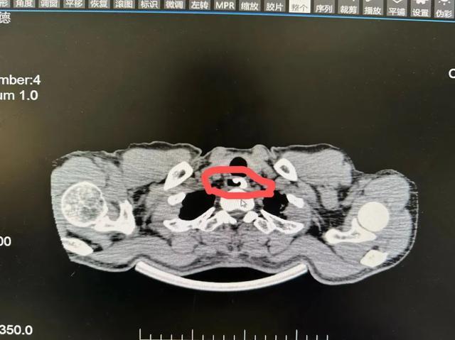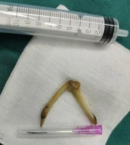 经过门诊医师仔细查看喉镜检查没有在咽喉部发现异物,进一步完善食道CT后发现一骨头状异物卡在食道入口下的位置,立即以“食道内异物”住进医院准备手术,住院后的黄大叔禁食禁饮7小时后在当日全麻下行了“硬性食道镜下食管探查+食管异物取出术”,手术主刀李智平主任术中发现在距离门齿19㎝的位置发现了卡住的鸡骨头,小心取出异物后发现异物所在的3点和9点方向存在黏膜损伤出血,术后经过抗感染,消肿,止血系列治疗后恢复良好出院。
