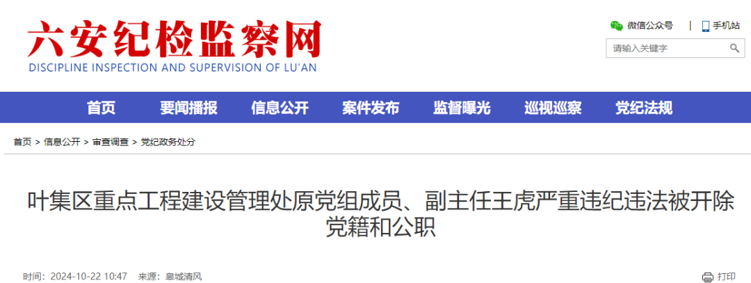 10月22日,王虎被开除党籍和公职。通报指出,王虎身为党员领导干部,丧失理想信念,背弃初心使命,纪法意识淡薄,漠视中央八项规定精神,长期收受礼品礼金,接受他人宴请安排;廉洁底线失守,挂证取酬,通过民间借贷获取大额回报;不正确履行工作职责,工程变更及签证把关不严,擅自安排工程项目违规施工;利用职务上的便利为他人在工程承揽、验收、资金拨付等方面谋取利益,非法收受财物。