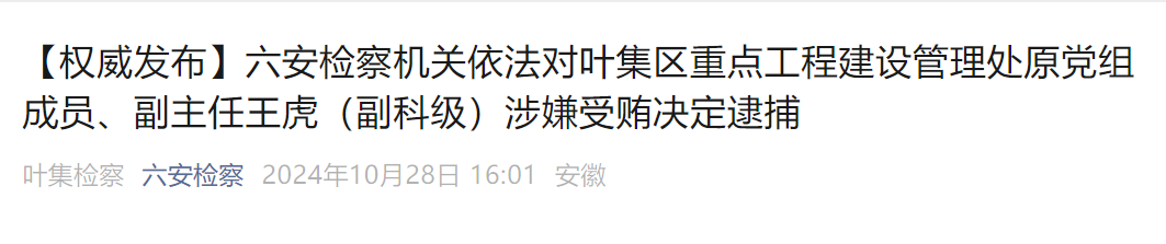 日前,六安市叶集区人民检察院依法以涉嫌受贿罪对王虎作出逮捕决定。该案正在进一步办理中。