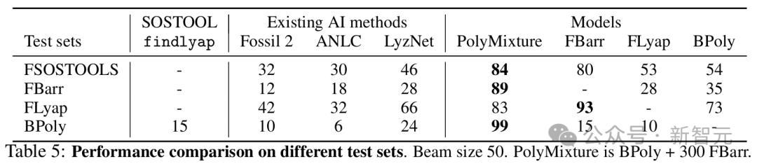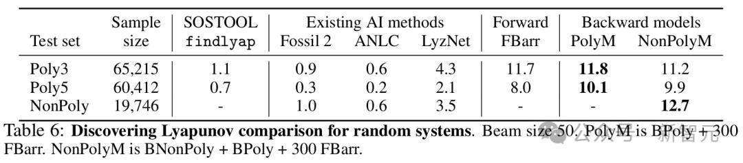 然后,将findlyap和基于AI的方法与两个在多项式系统上训练的模型进行比较:FBarr和PolyM(ixture)——BPoly与来自FBarr的300个示例的混合——以及一个在BPoly、BNonPoly和来自FBarr的300个示例的混合上训练的模型(NonPolyM)。