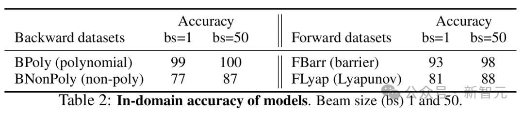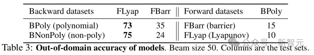 反向模型在具有障碍函数的正向生成系统集(FBarr)上的较低准确率,可能是因为许多障碍函数不一定是李雅普诺夫函数。在这些测试集上,反向模型必须应对不同的分布和略有不同的任务。