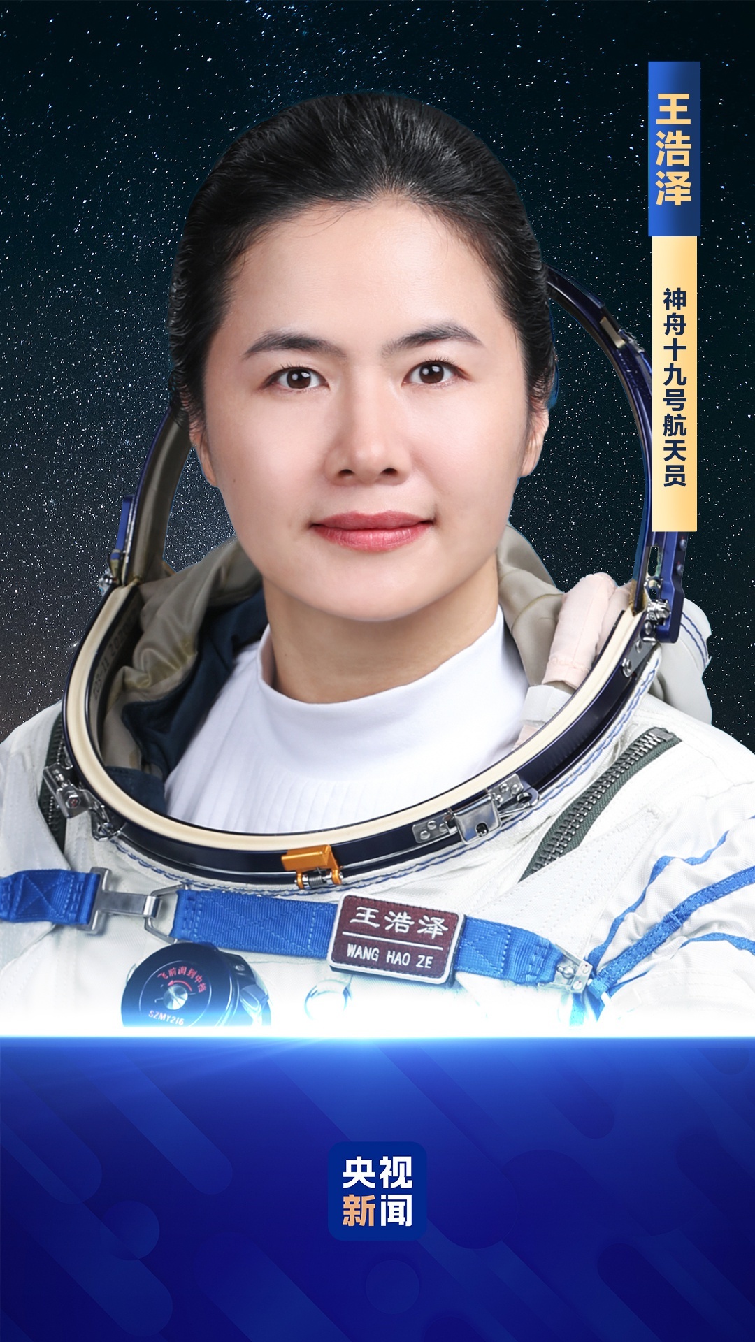 王浩泽,女,满族,籍贯河北滦平,硕士学位。1990年3月出生,2021年1月入伍,2009年12月加入中国共产党,现为中国人民解放军航天员大队四级航天员,陆军中校军衔。曾任中国航天科技集团有限公司高级工程师。2020年9月入选为我国第三批航天员。经全面考评,入选神舟十九号载人飞行任务乘组。