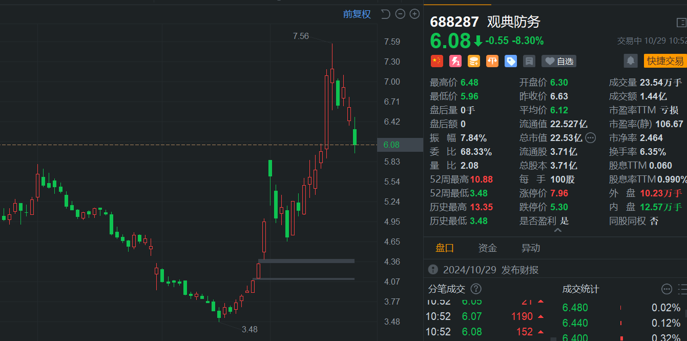 无人机服务提供商观典防务(688287.SH)现跌8.3%,报6元,总市值22.5亿元。公司昨日晚间公告,前三季度实现营收7426万元,同比下降56.28%;归母净利润亏损6081万元;扣非净利润亏损6462万元。此外,控股方资金占用1.49亿元,公司股票交易可能被实施其他风险警示。(格隆汇)