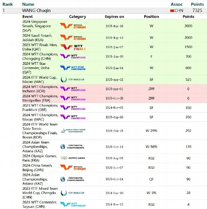今天,2024国际乒联第44周世界排名公布,官网信息显示,王楚钦、樊振东、马龙、陈梦因未参加WTT蒙彼利埃冠军赛被赋0(ZPP),此次被赋0将延续至2025年10月28日。